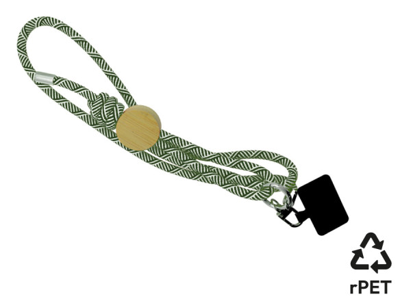 Lanyard aus RPET mit einer Länge von 160 cm und einer Dicke von 8 mm. Universelles und abnehmbares Pad aus Polyester zur Befestigung von Handys mittels ihrer Hülle. Ring und Enden der Schnüre aus rostfreiem Edelstahl. Inklusive Bambus-Schnalle.